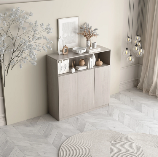 The TV stand looks fantastic in my living room, enhancing the overall aesthetic with its sleek design and natural wood finish. It fits perfectly under my wall-mounted TV, offering ample storage with its three drawers and two cabinets. The glass doors provide an elegant touch, allowing my decor items to be showcased beautifully. The sturdy construction and modern details, like the recessed plinth bases and blocky pulls, add to its timeless appeal. It's not just a TV stand but a stylish piece that ties the room together. Highly recommended for anyone looking to upgrade their living space with both functionality and elegance.